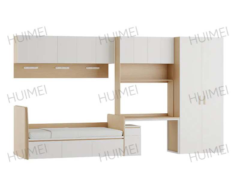 Рабочая/учебная зона (нижняя койка): Это ядро многофункциональная общая кровать . Обычно он включает в себя просторный письменный стол, многоярусные книжные полки и место для настольного компьютера или ноутбука. Такая конструкция обеспечивает конфиденциальность и сосредоточенность на учебе — преимущество, не имеющее аналогов у традиционных двухъярусных кроватей.